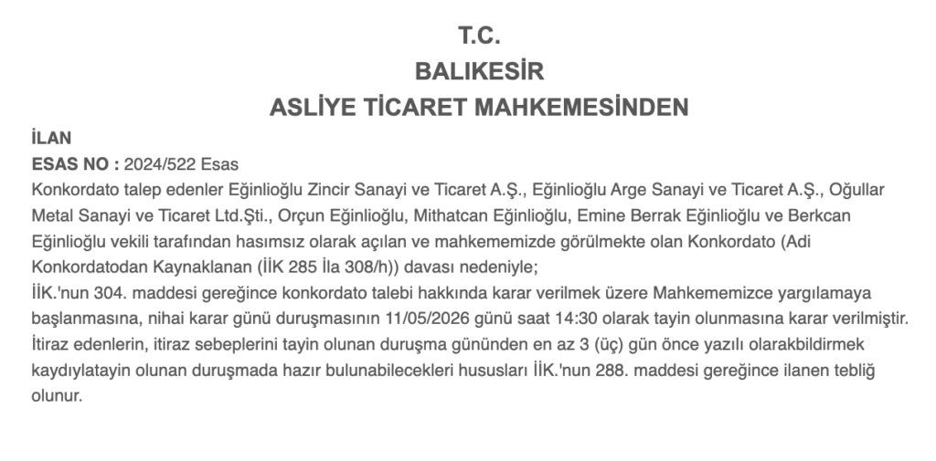 Balıkesir Asliye Mahkemesi’nin bildirimine göre Eğinlioğlu Zincir Sanayi ve Ticaret A.Ş., Eğinlioğlu Arge Sanayi ve Ticaret A.Ş., Oğullar Metal Sanayi ve Ticaret Ltd.Şti., için konkordato talep edildi.