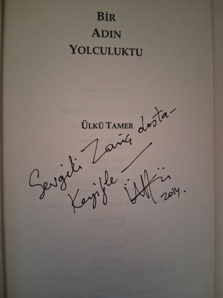 Kitaba da adını veren ‘Bir Adın Yolculuktu‘ şiirinin 4’üncü bölümü böyle akıp gidiyor Ülkü Tamer’in. Kitap o yıl martta çıkmış, söyleşide görüşeceğiz diye yanımda götürmüşüm, imzalamış. Nereden nereye…