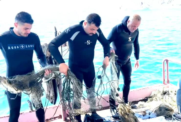 Van Gölü’ne dalan dalgıçlar, mikrobiyalitlere (mercan) dolanan yaklaşık 300 metre hayalet ağı temizledi.