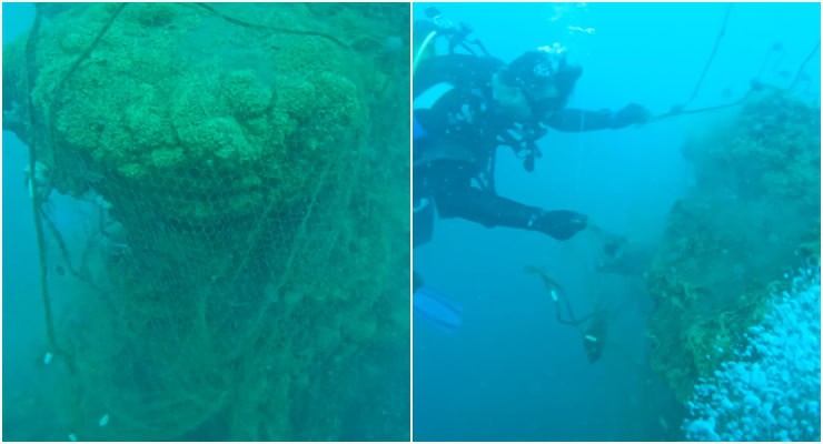 Dalışta 21 metre derinlikte mikrobiyalitlere dolanan 600 metre civarında hayalet ağ tespit eden Birol ve dernek üyeleri, 45 dakikalık çalışmayla ağın 300 metresini su yüzüne çıkardı.