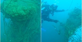 Van Gölü’ne dalan dalgıçlar, mikrobiyalitlere (mercan) dolanan yaklaşık 300 metre hayalet ağı temizledi.