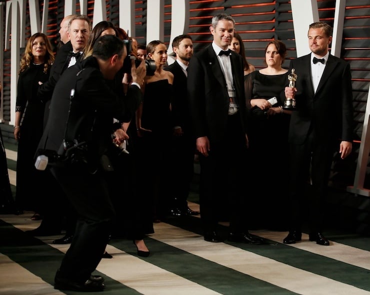 Actor Leonardo DiCaprio holds his award for Best Actor for the film “The Revenant” as he arrives at the Vanity Fair Oscar Party in Beverly Hills, California