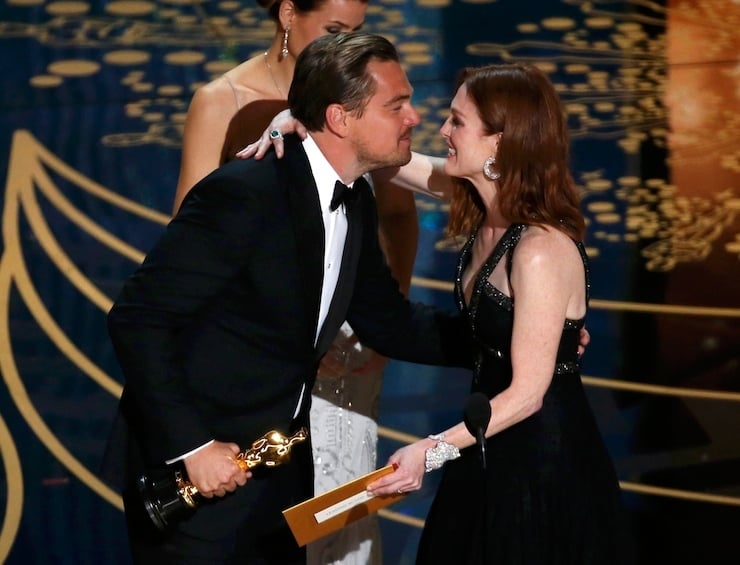 Leonardo DiCaprio receives the Oscar for Best Actor for the movie “The Revenant” from Julianne Moore at the 88th Academy Awards in Hollywood