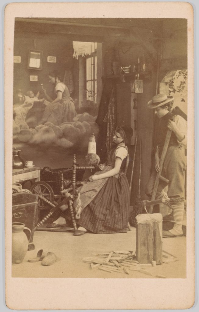 Yaklaşık 1870-1890 yıllarına tarihlenen anonim fotoğraf, bir kadının gündelik halini ve annelik hayalini aynı karede birleştiriyor. Fotoğraf, karanlık odada kağıdın bir kısmının ışık almasının engellenmesi ve sonradan ikinci bir negatif eklenmesiyle oluşturulmuş.