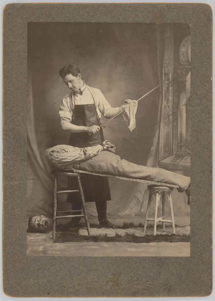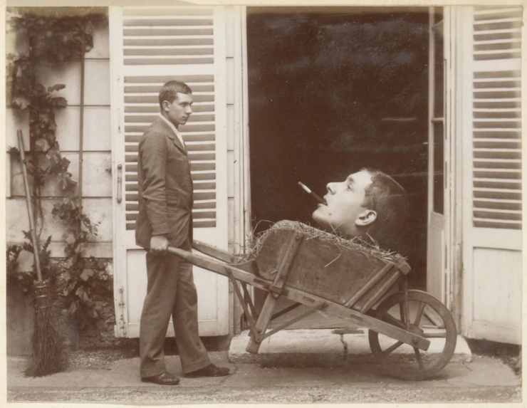 1900-1910’a tarihlenen anonim fotomontaj, iki negatifin birleştirilmesiyle oluşturulmuş. Fotoğraf, ölçek manipülasyonu ve kes-yapıştır tekniği kullanılarak hazırlanmış. Kesilip yapıştırılmış kısmı gizlemek için arkadaki açık kapı fon olarak kullanılmış.