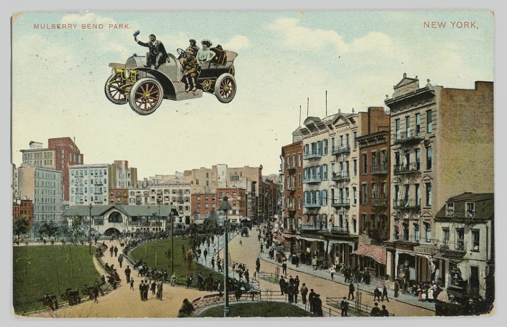 Theodor Eismann’a ait 1908 tarihli fotoğrafta kes-yapıştır teknikleriyle hayali bir gelecek sahnesi oluşturulmuş. Fotoğraf sonradan renklendirilmiş. New York semalarında uçan bir araba görülüyor.