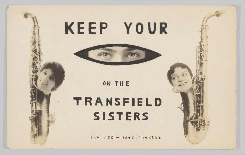 1904-1918 tarihli anonim reklam, Transfield Sisters grubunu tanıtmak için hazırlanmış ve fotomontaj teknikleriyle farklı boyut ve açılarda fotoğraflar birleştirilmiş.