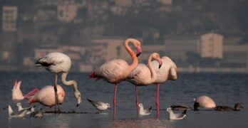 Kentleşmeyle yaşam alanları daralan flamingolar, kış aylarında beslenmek için İzmir Körfezi’ne sığınıyor.