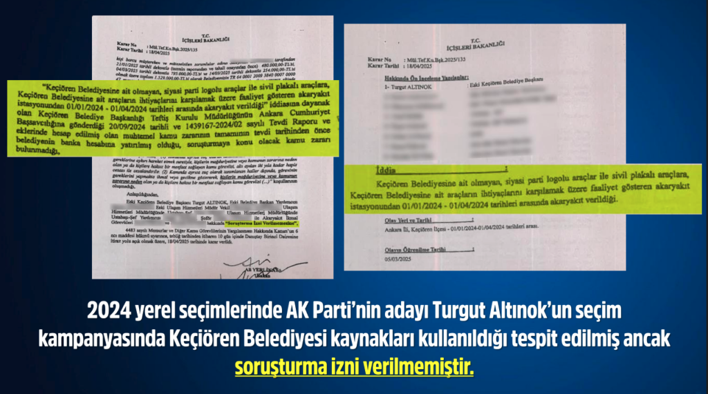 * Geliyoruz 2024’te. Aynı şeyi Turgut Altınok yapmış, şikayet edilmiş. İçişleri Bakanlığı ona soruşturma izni vermemiş. Suçu inkar etmiyor, “Zararın tamamını ödemiştir, kamu zararı ortadan kalkmıştır” diyor. İşte burada çifte standardı gözler önüne sermek için bu belgeyi gösteriyorum.