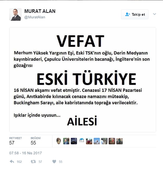 İktidara yakınlığı ve provokatif haberleriyle bilinen Yeni Akit gazetesinin haber müdürü Murat Alan, referandum sonuçlarına yönelik, ‘Eski Türkiye’nin vefatı’nı duyuran bir ilan paylaştı.