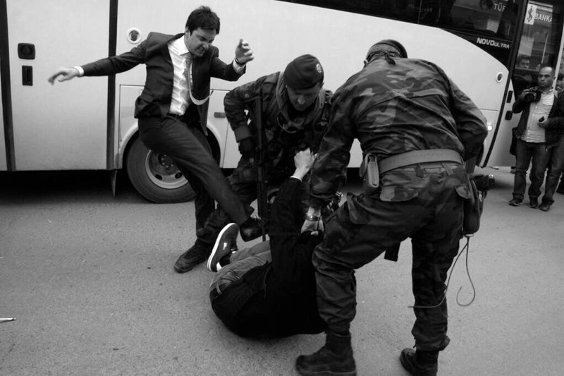 Bu hareketinin ardından aracın hemen önündeki bir özel harekat elemanı tarafından yere yatırılan protestocu, o noktaya koşarak gelen Başbakanlık Müşaviri Yusuf Yerkel tarafından tekmelenmeye başlıyor.