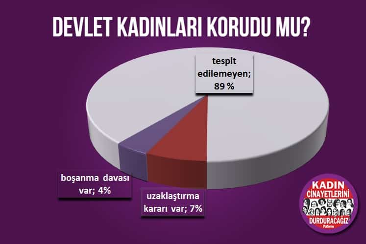 Ocak ayında öldürülen kadınların yüzde 89’unun koruma kararının olup olmadığı tespit edilemezken; yüzde 7’sinin uzaklaştırma kararı olduğu biliniyor.