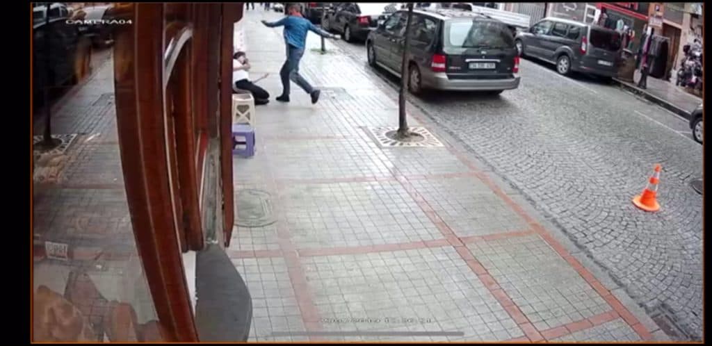 Öte yandan, sokak ortasında R.T.’nin uğradığı saldırı anları ise çevredeki iş yerine ait güvenlik kamerası görüntülerine yansıdı. Görüntülerde, saldırgan şüphelinin taburede oturan R.T.’ye tekmeyle saldırdığı ve çevredekilerin olaya müdahale ettiği görülüyor.